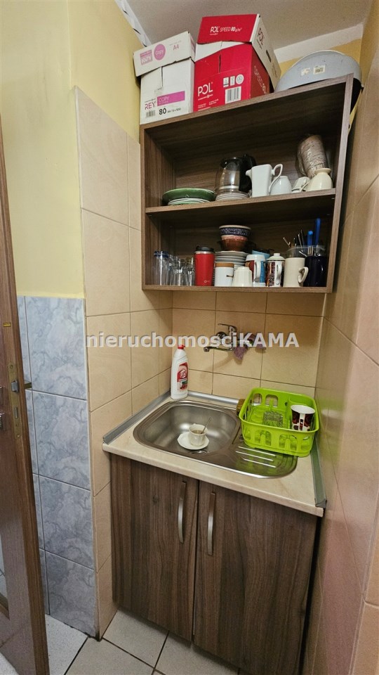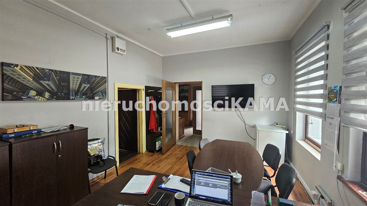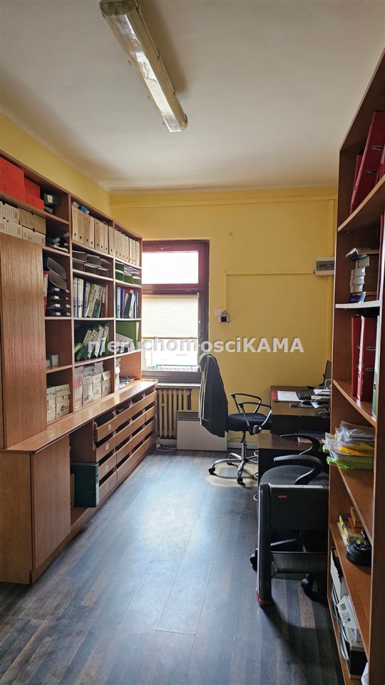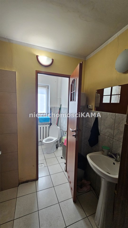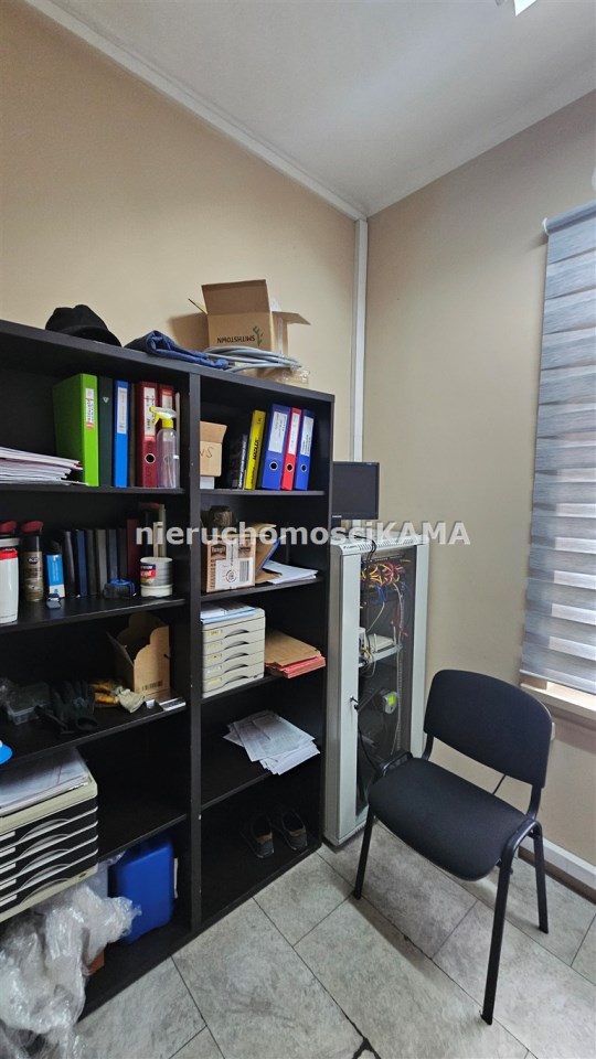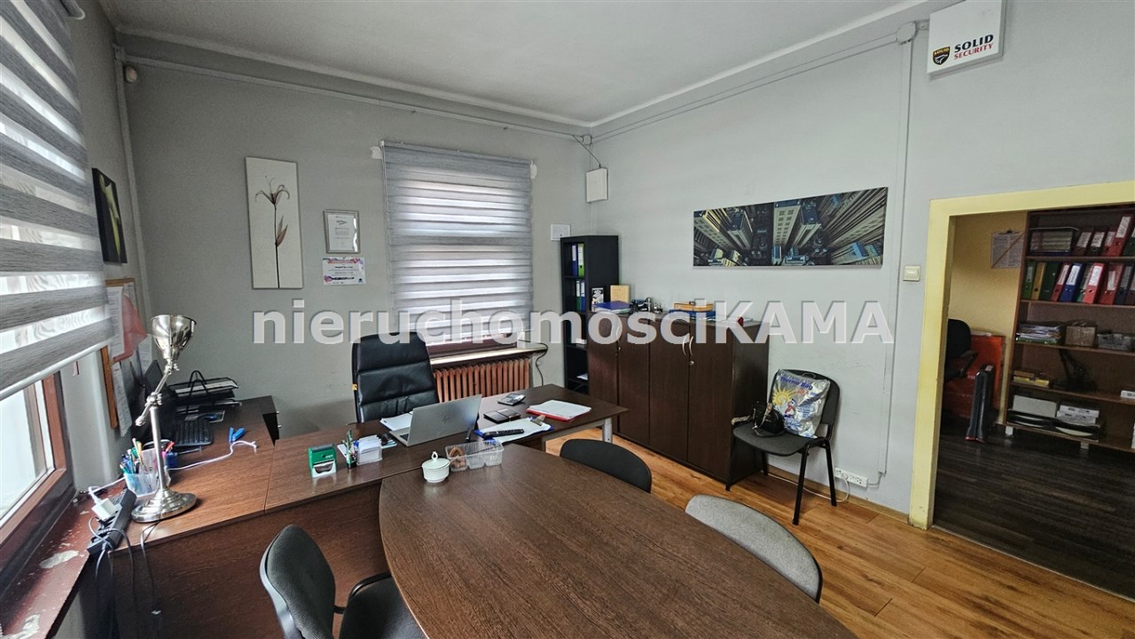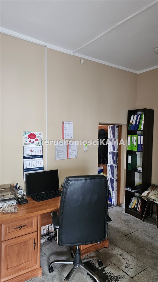 2. Budynek użytkowo-mieszkalny: Dwukondygnacyjny budynek, częściowo podpiwniczony, z dostępem do zaplecza sanitarnego na obu poziomach. Na parterze z tarasem wejściowym do części biurowej oraz z poziomu "0" z wejściem do dwóch pomieszczeń produkcyjnych, jedno z wejściem od ulicy. Na piętro również od strony ulicy wprowadza wejście na mieszkania 97m2. Budynek murowany z cegły, dach konstrukcji drewnianej pokryty blachą ze stali falistej, okna częściowo drewniane.