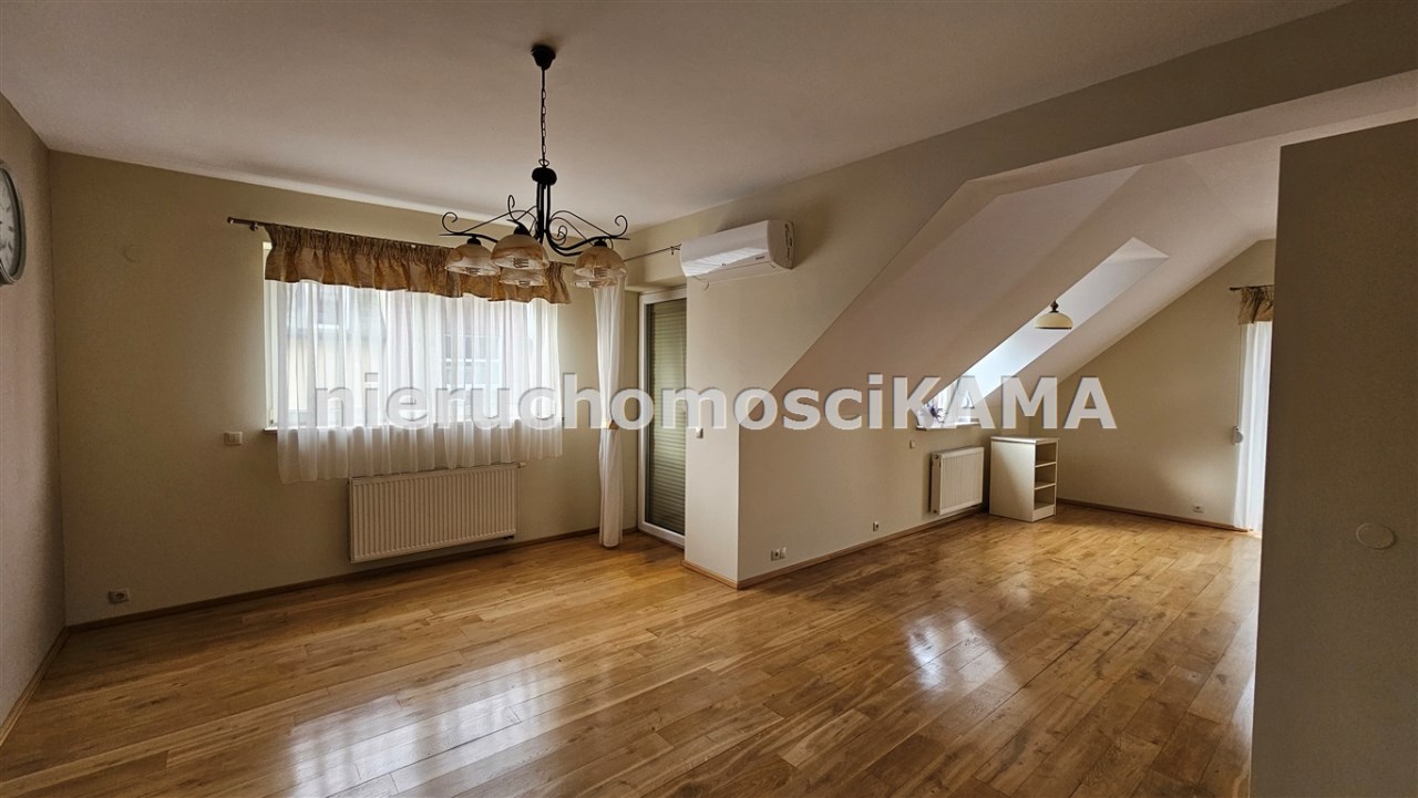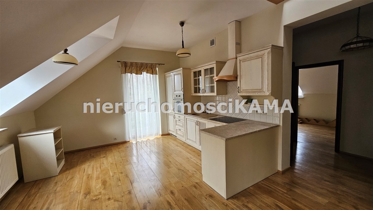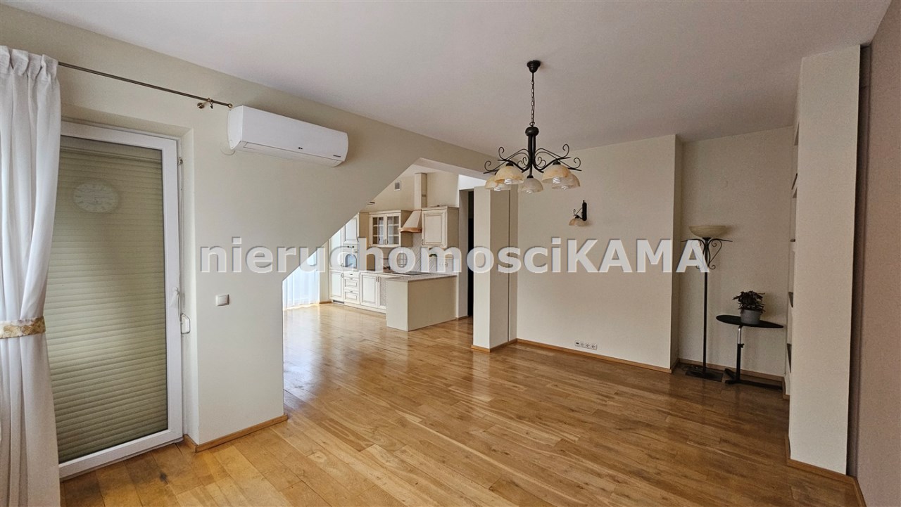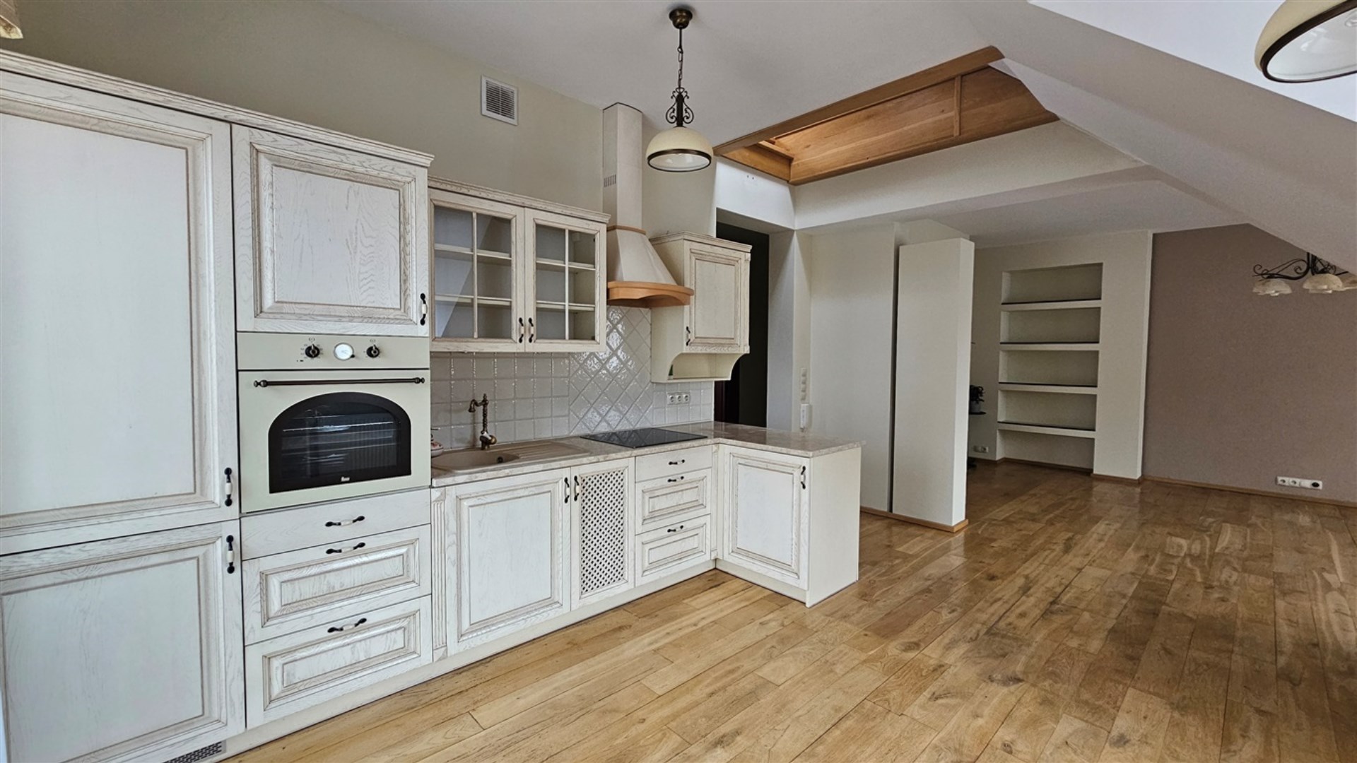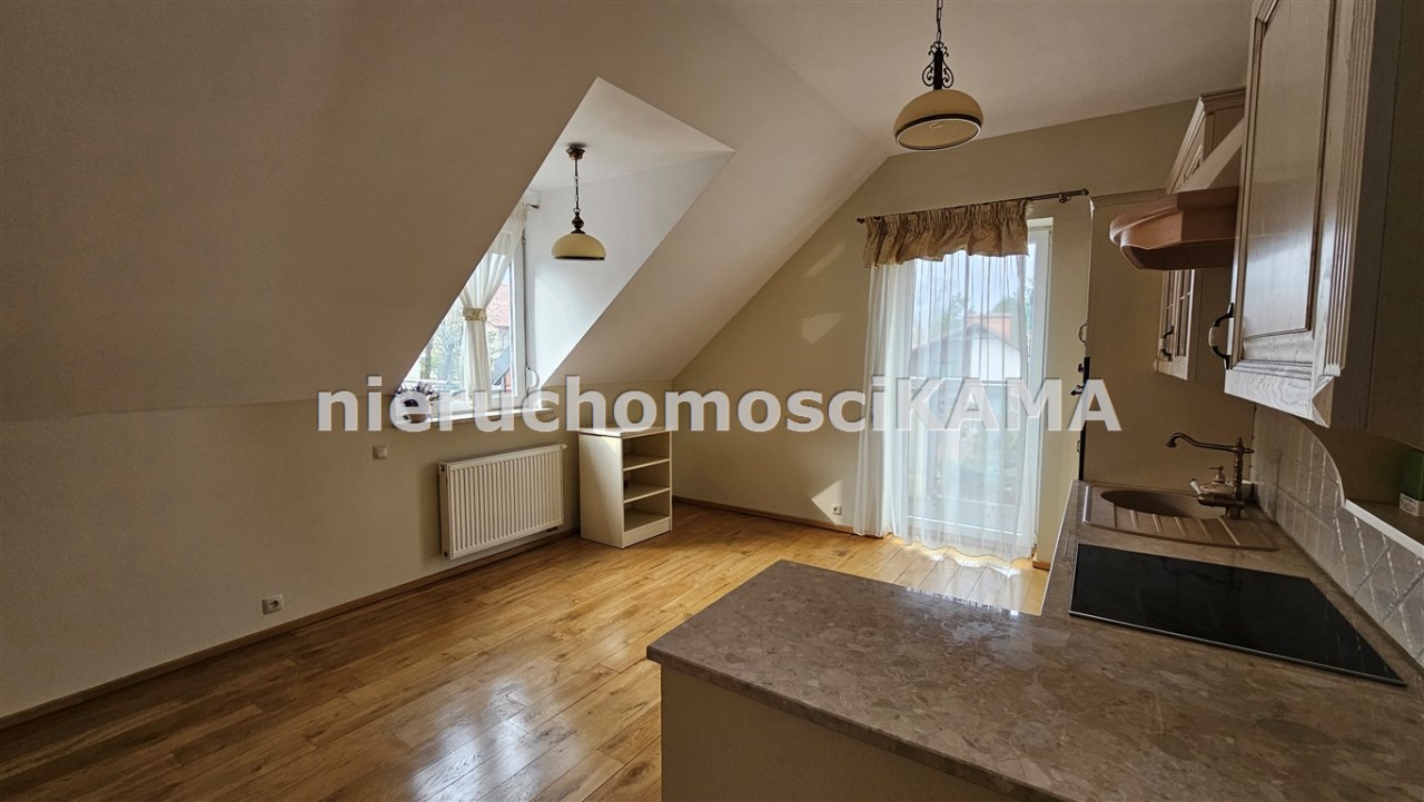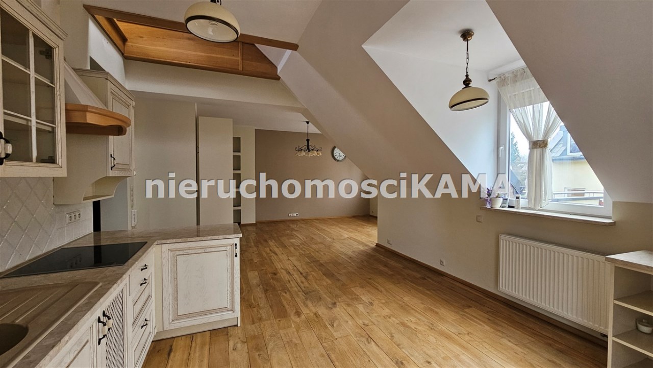 Funkcjonalny rozkład pomieszczeń: powierzchnia całkowita składająca się z: korytarz wejściowy, salon z klimatyzacją z wyjściem na taras (11,76m2) otwarty na kuchnię z balkonem (3,6m2), kuchnia w zabudowie (lodówka, piekarnik, okap kuchenny, płyta grzewcza), dwie sypialnie, łazienka z wanną i WC oraz pralką, dodatkowo nie wliczone w powierzchnię poddasze mogące pełnić funkcję dodatkowej sypialni, pokoju lub gabinetu.